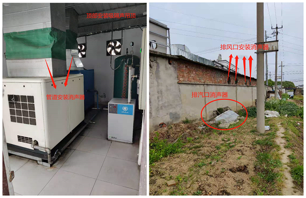 (3)空壓機(jī)房隔聲加強(qiáng)。空壓機(jī)噪聲較高且靠近廠界,機(jī)房頂部為單層彩鋼板,隔聲量不足,需要進(jìn)行隔聲加強(qiáng),空壓機(jī)房靠近廠界側(cè)有4套排風(fēng)扇,存在漏聲,空壓機(jī)散熱口風(fēng)管為單層鐵板,均需要加裝消聲器,底部排汽口加裝消聲器。