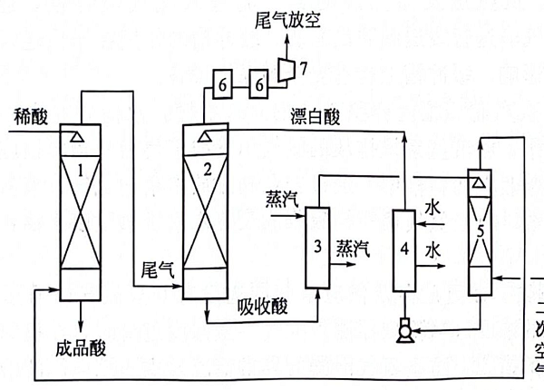 1-硝酸吸收塔;2-尾氣吸收塔;3一加熱器;4一冷卻器;5-漂白塔;6-尾氣預熱器;7-尾氣透平